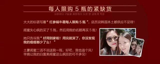 红参紧致收毛孔、EGF弹力提拉、润泽提亮缓皱、舒缓镇定修复、细腻嫩滑保湿、祛痘痕痘印淡斑,一瓶具有神奇效果的美肤霜,内含螺旋蜗牛分泌液12600mg,能全面改善皮肤素质。尤其对于淡化疤痕、暗疮印、斑点和缩小毛孔方面有非常神奇的功效。是全世界皮肤医师推荐使用的护肤保养品。使用后,肌肤能明显变得柔嫩紧实,细纹减少,较深的皱纹与粗大的毛孔也能轻易获得改善,甚至最干燥及过敏性肌肤也能恢复到健康自然的状态。
