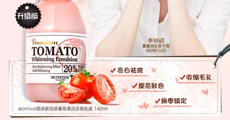 小番茄的美白大力量,skinfood思亲肤顶级番茄美白乳液140ml。韩国明星、大众都喜爱的超自然美白传奇。高浓度20%天然番茄精华,亮白淡斑、提亮肤色、换季镇定、收缩毛孔。粗糙暗淡肤色重新焕发透亮。更添加美白机能,100% 亮泽柔嫩肌肤。番茄给力,给你大自然的美白奇迹!
