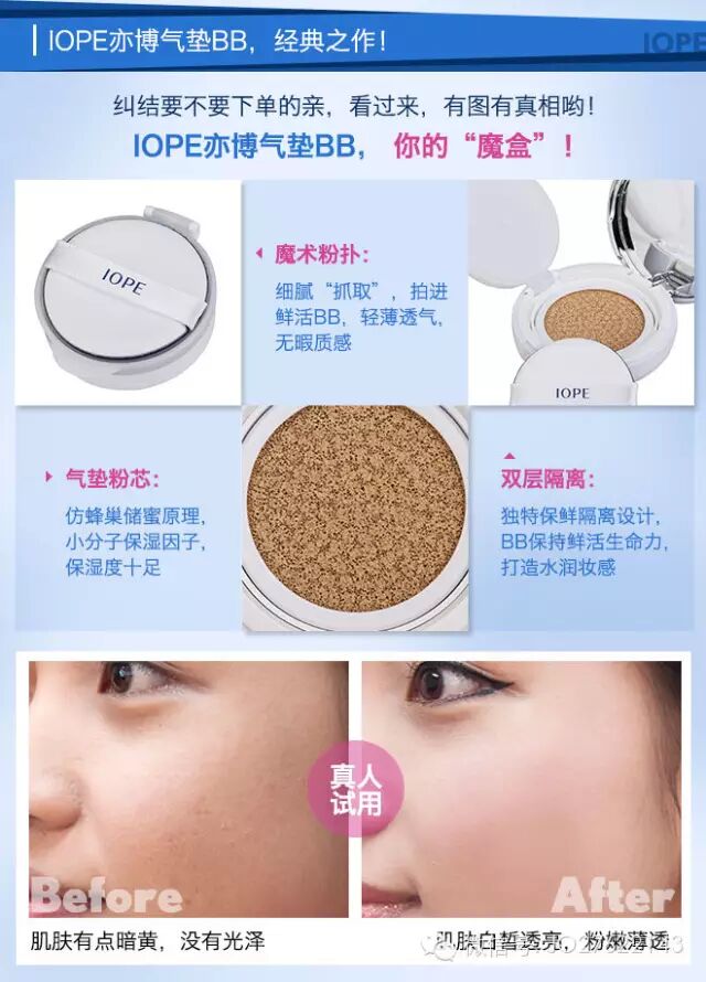 掌握二千15秒美颜诱惑,推倒叫兽不费力!来自“星星”的IOPE亦博气垫型BB15g+15g!韩系裸妆永恒经典,同品类销量TOP1,气垫概念BB鼻祖!它轻透质地,极易涂抹,瞬间焕发莹润迷人光采。获得自然无瑕肤感。多色可选,附送替换装!