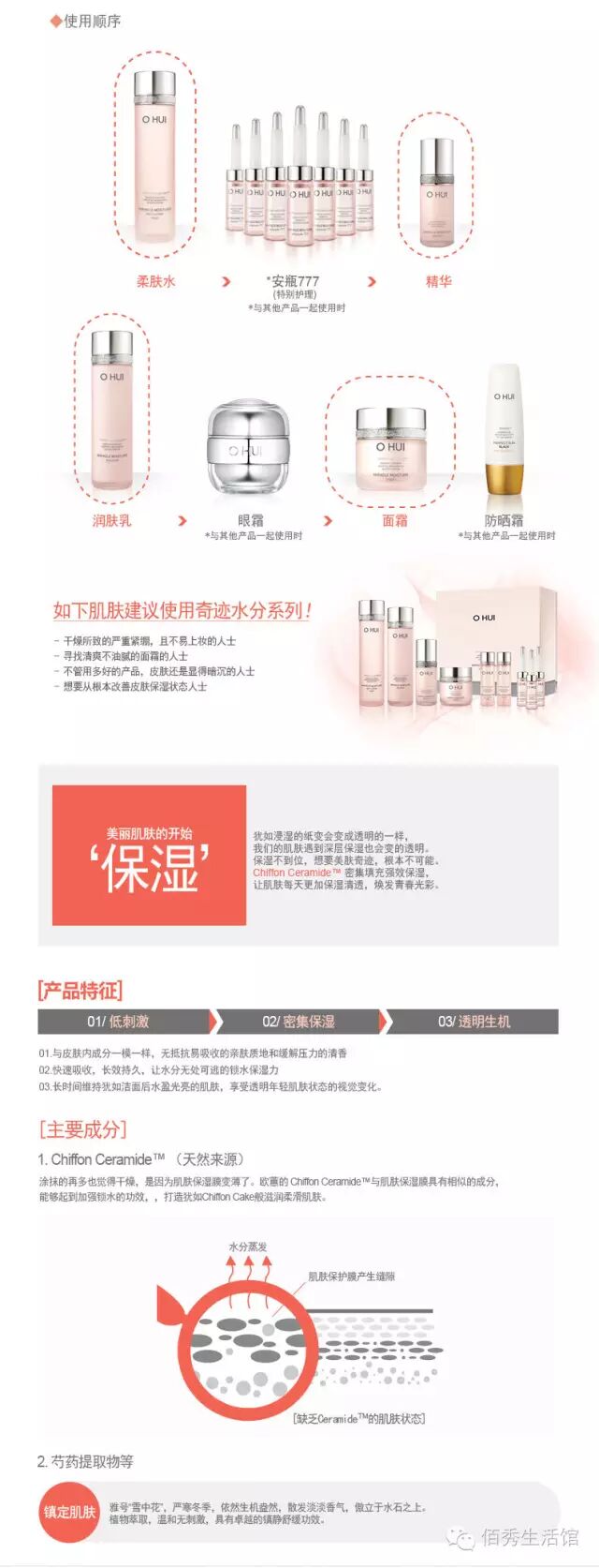 补水系统的尖端补水技术* rHES CP(recombinant HUman Stem Protein)是补水系统的核心成分,表皮干细胞培养液。和法国专业研究机构共同研究开发的科技成果,欧蕙独家核心成分。强化皮肤原有的水分调节机能,皮肤强化保湿成分。新推出的补水的系列,全面升级像潺潺的流水一样滋润您的肌肤,持续提供水份,使用感相当的清爽,开通皮肤中的水分通道,使皮肤保持滋润。